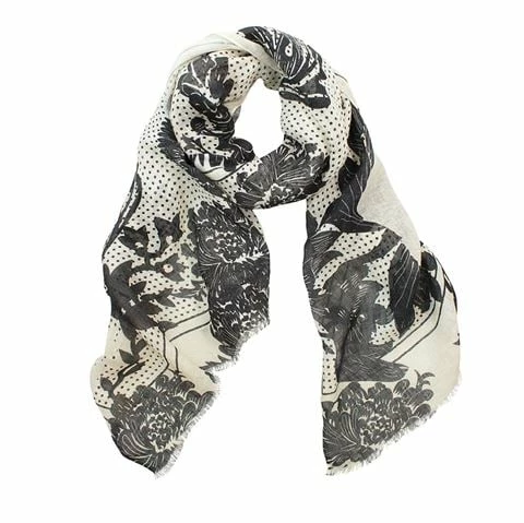 This scarf is woven from fine, soft linen yarns and is hand printed in a spot and botanical design with a 4 side printed border. Can be worn as a wrap too – in any season!