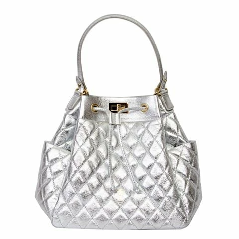 Marlafiji’s Lulu Duffel Bag comes in luxurious quilted Italian leather in a chic slouchy shape with a glistening gold toned chain and leather shoulder strap to offset this fashionable duffe. It’s a contender with one of the shiniest duffels around and adorned with the Marlafiji gold palm tree emblem.