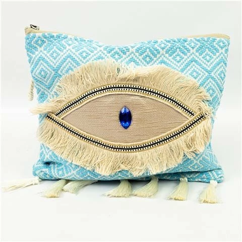 The eye has it on this luxurious Sorena Medusa Clutch from the Resort collection. Hand crafted in the finest Greek woven fabric and embellished with a silky eyelid with a jewelled eye at its centre, this is a bag to bring its owner fashionable good fortune. With a tassel fringe, embroidered golden thread detailing and silky fringes around the eye to resemble eyelashes, this is a accessory that will be noticed and admired wherever you go.